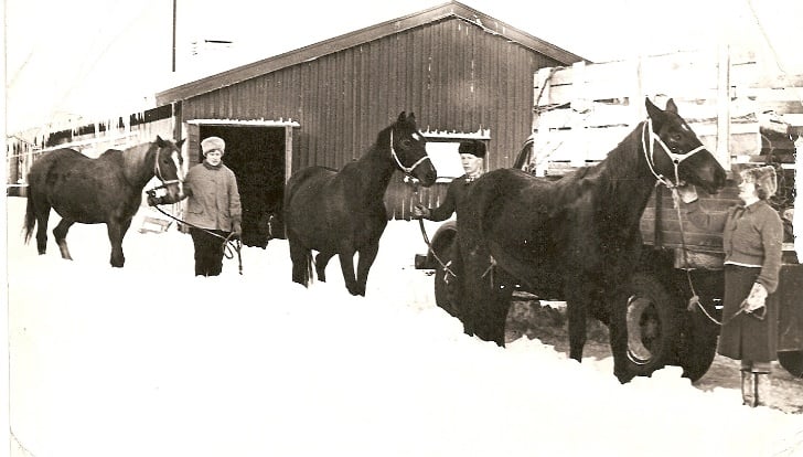 1966. a. talvel jõudsid meie ostetud hobused karantiinitalli Luigel. Hobuseid talutavad Reet Laev (Proover), Madis Hallingu ja keegi tundmatu.