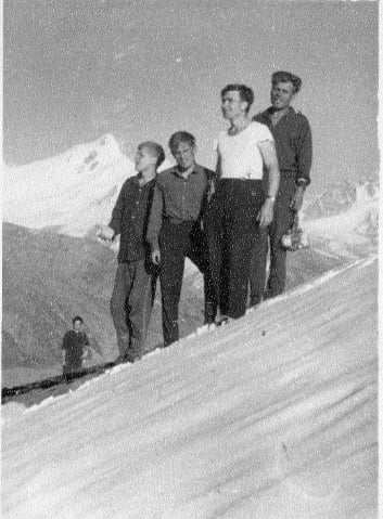 Ainuke pilt, mille sellest reisist leidsin. Sõitsime koos leedulastega Medeo kuulsat liuvälja vaatama ja vaidlesime bussis, kas on võimalik kohe minna igilumeni, mis eemal paistis. Kõik kaasa ei tulnud, aga lumeni mõned meist jõudsid. Ei olnud igilumi või -jää, vaid värskelt sadanud lumi. Hea aseaine seegi. Paremalt esimene Eduard Erkman, vasakult teine Raigo Kollom, teised on leedulased, osa eestlasi veel tulemas.