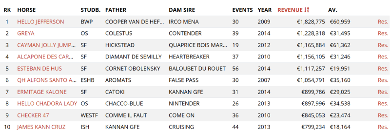 Horsetelex koondab võistlustulemusi ja auhinnaraha statistikat rahvusvahelistest andmeallikatest ning tõuraamatutest. Eesti sporthobuste varasem tippmark kuulus Horsetelexi andmetel Bonne Amiele (A Big Boy – Landfriese, aretaja Trooja Hobune OÜ), kelle auhinnarahade summa ulatus 2024. aastal ligikaudu 432 000 euroni. 2025. aasta tulemusega ületas QH Alfons Santo Antonio selle näitaja enam kui kahekordselt.